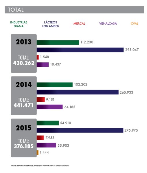 En el caso de Lácteos Los Andes la contracción en la producción ha sido progresiva y sostenida. Entre 2013 y 2015 la empresa dejó de fabricar 34 mil 951 toneladas de derivados lácteos y otras bebidas.